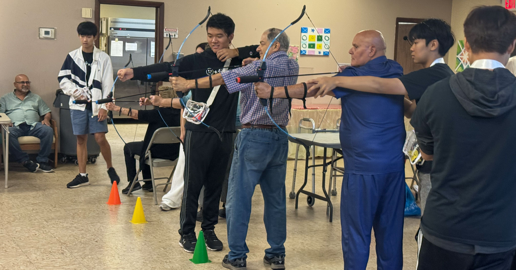 Physically, participants stretch, practice drills, draw the bow and release arrows. Even seniors in wheelchairs or with limited mobility can fully participate. Cognitively, they focus on posture, aim, memory and hand-eye coordination.
